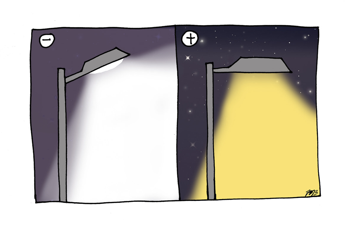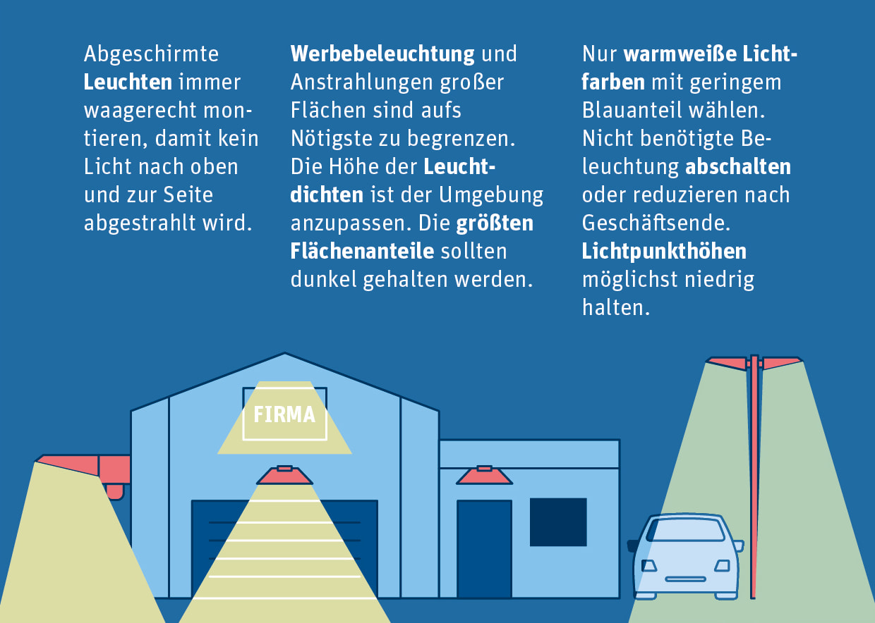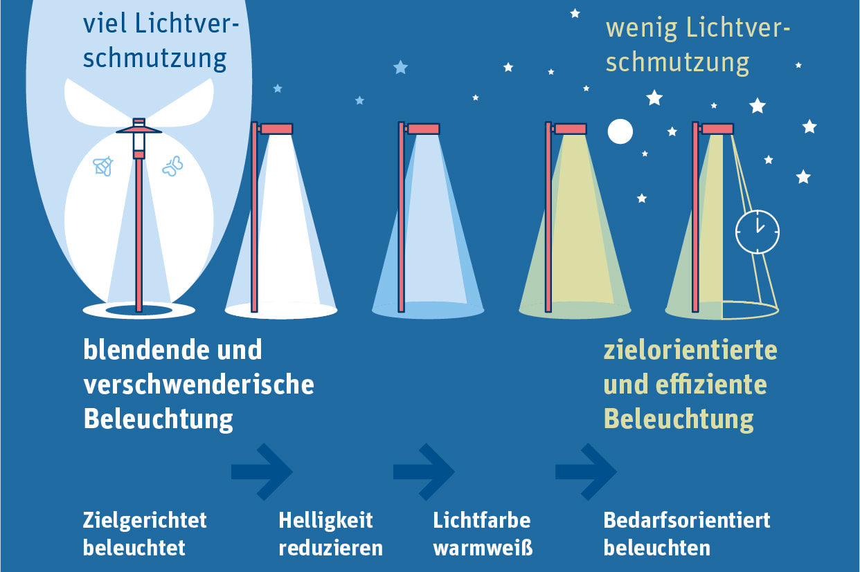 Grundsätzlich ist gute Beleuchtung immer nach unten gerichtet und blendfrei. Dazu verwendet man sog. voll-abgeschirmte Leuchten. Zudem verwendet man am besten eine warme Lichtfarbe mit nicht mehr als max. 3000 Kelvin Farbtemperatur. Die Beleuchtungsanlagen sollten intelligent gesteuert sein und das Licht nur dann eingeschaltet sein, wenn es tatsächlich gebraucht wird – und zudem in angemessener Lichtmenge. An der Reduzierung der Lichtverschmutzung kann jeder, egal ob Privatperson, Unternehmen, Handel, Gastronomie oder Verband, aktiv mitwirken.