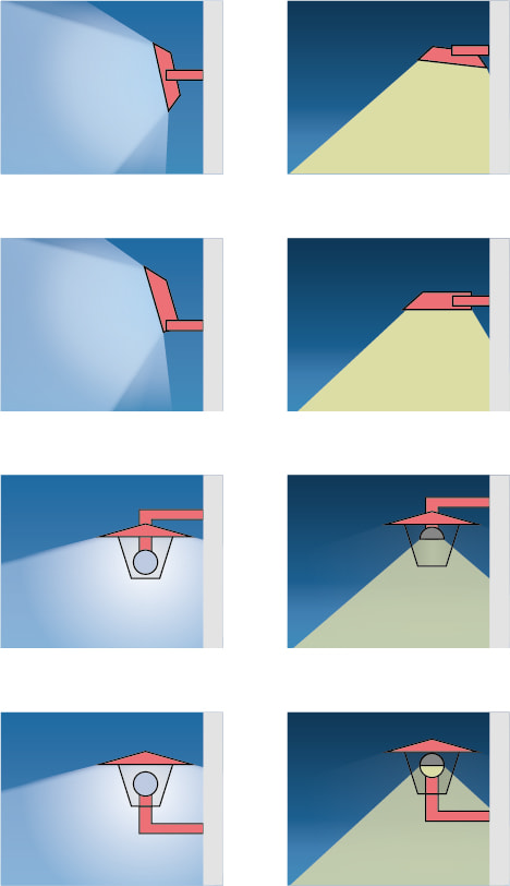 Lichtlenkung: Herstellung einer zielgerichteten und möglichst blendfreien Beleuchtung. Abstrahlungen über den Bestimmungsbereich hinaus, z.B. oberhalb der der horizontalen, nicht zu beleuchtenden Flächen und Objekte sind zu vermeiden. Zur Vermeidung ungerichteter Abstrahlung sind nur voll-abgeschirmte Leuchten einzusetzen. Das bedeutet, dass der Beleuchtungskörper so abschirmt und montiert sein muss, dass kein Licht in oder oberhalb der Horizontale abgestrahlt wird.